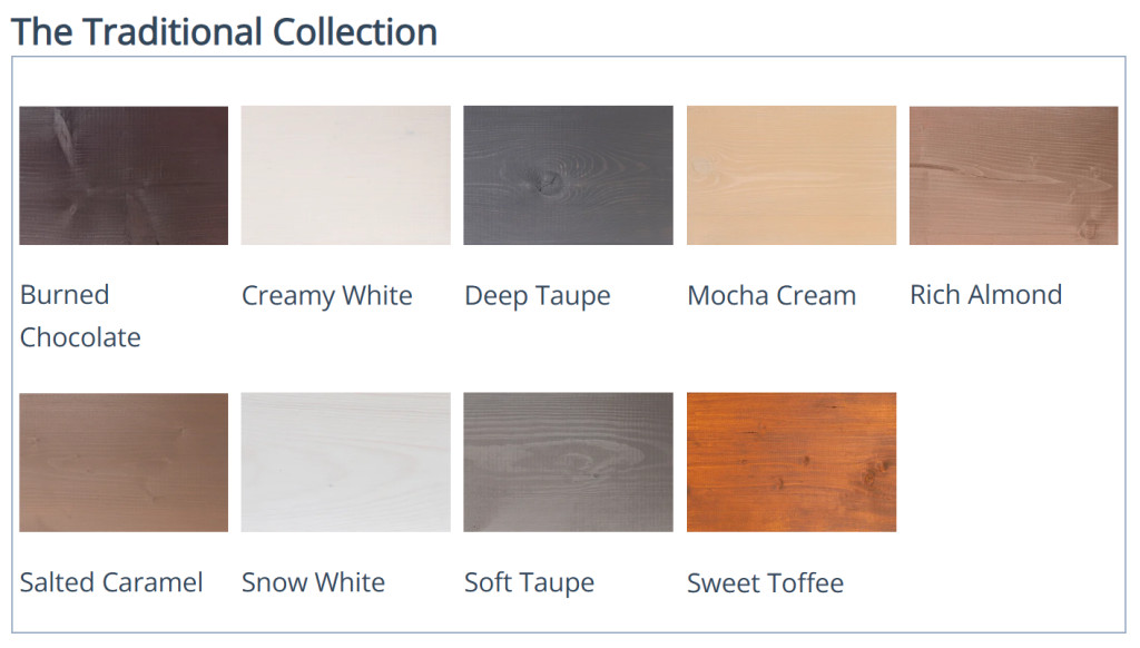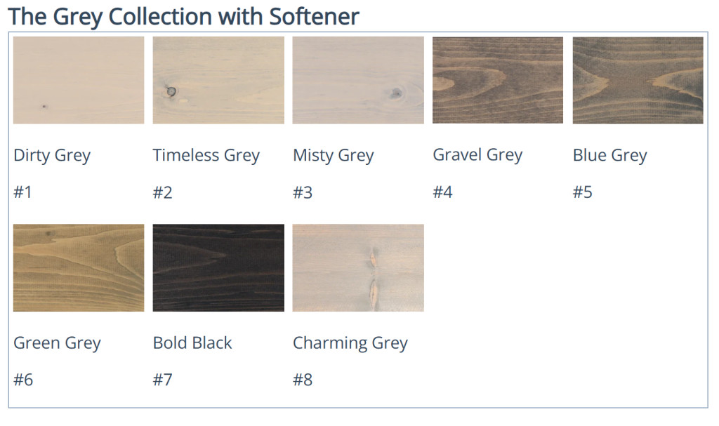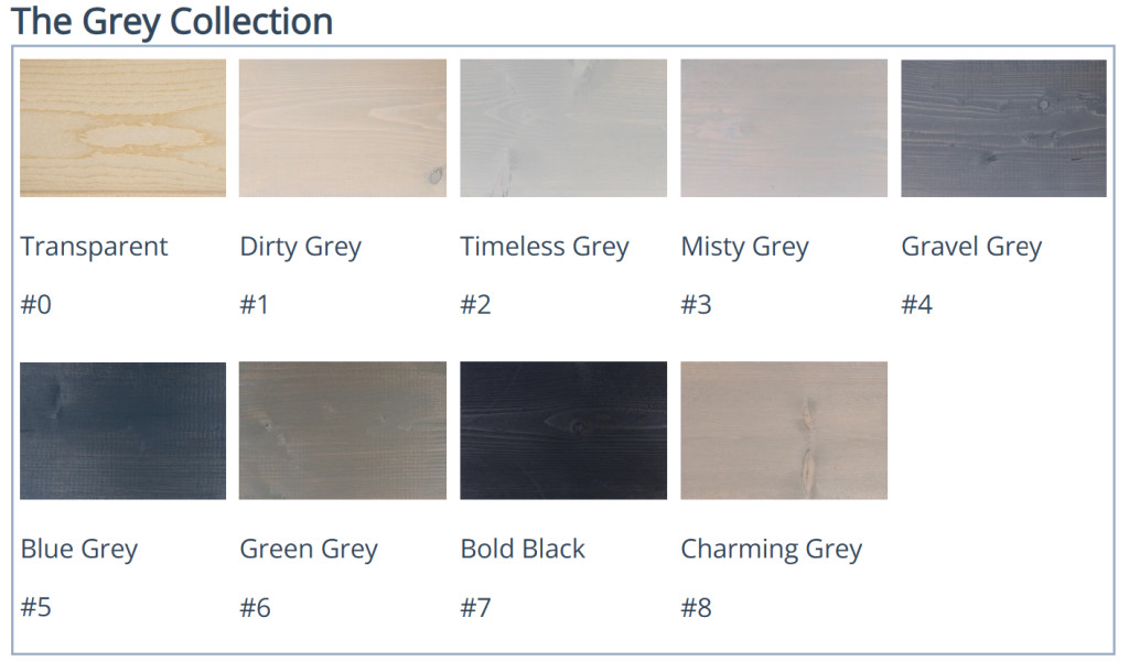 • Szürke kollekció: 9 szürke árnyalat kapható, amelyek nemes és egyenletesen szürke patinát kölcsönöznek a fának.